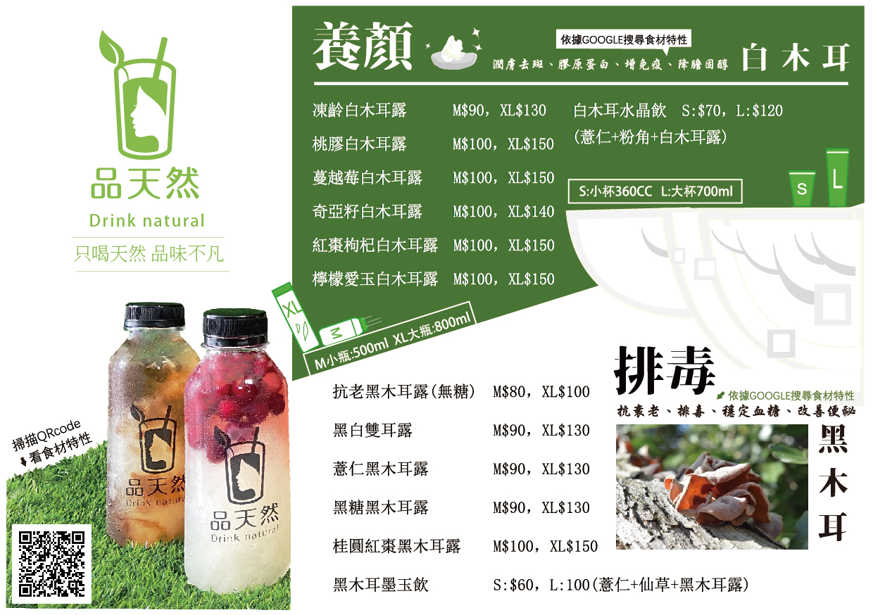 嚴選黑木耳,熬煮出膠質感十足的黑木耳露,搭配桂圓紅棗、薏仁、仙草、愛玉飲等天然食材,喝起來順口不甜膩,喝完有感、讓你輕鬆無負擔。